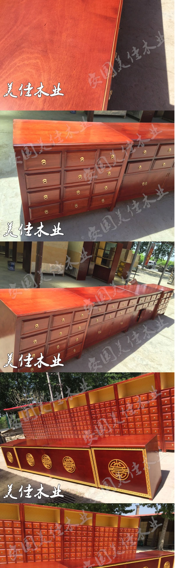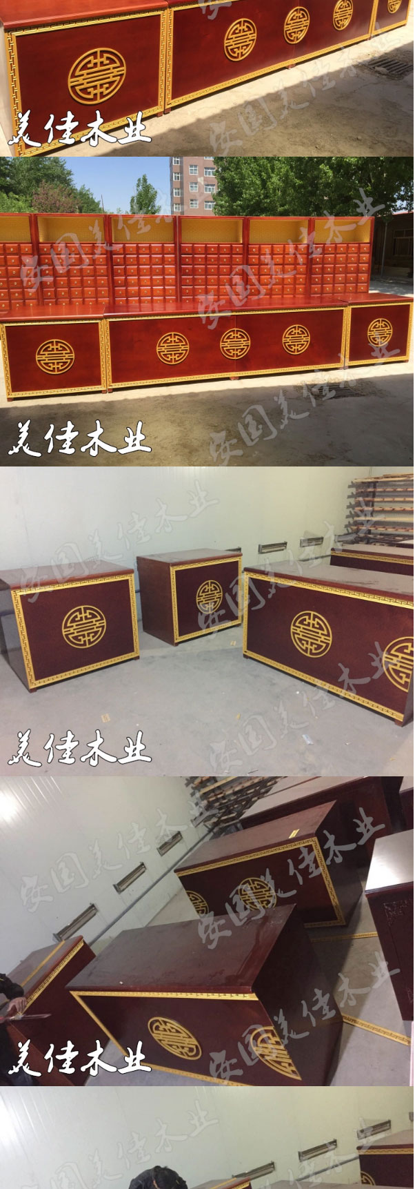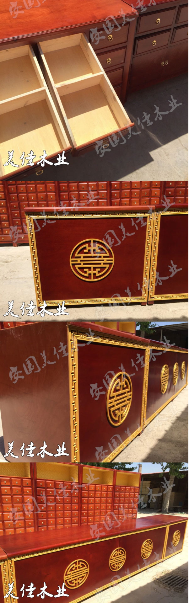 中藥柜展示臺用料---框架和抽屜選用優質樟松木,抽屜下面有七合板封底,防串味,抽屜底選用九厘板,中藥柜的后背兩側頂部選用七合板。