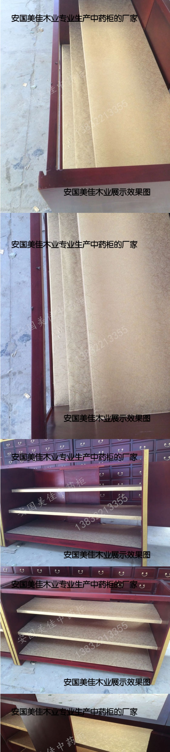 中藥柜展示臺用料---框架和抽屜選用優(yōu)質(zhì)樟松木,抽屜下面有五合板封底,防串味,抽屜底選用九厘板,中藥柜的后背兩側(cè)頂部選用五合板。