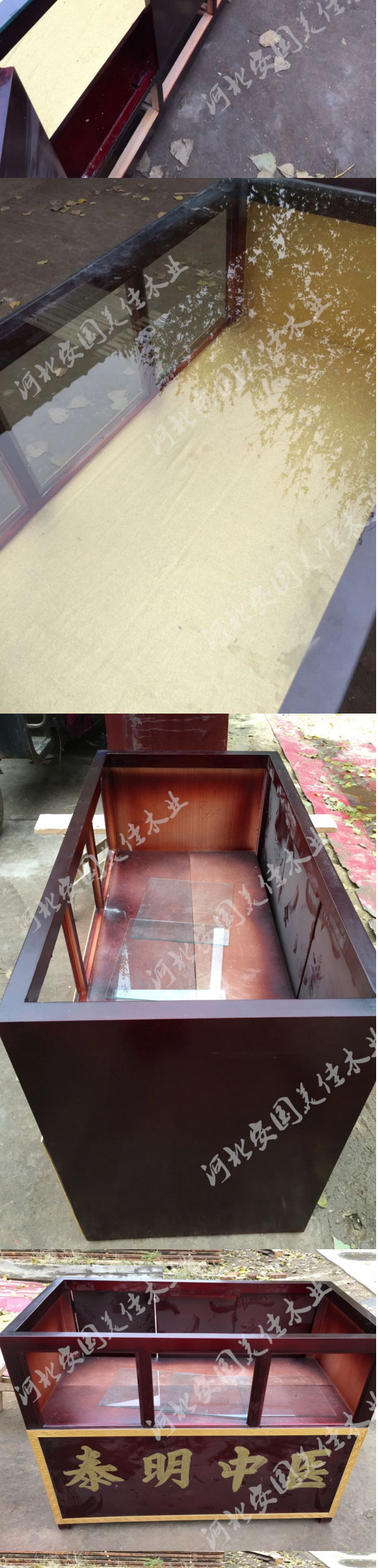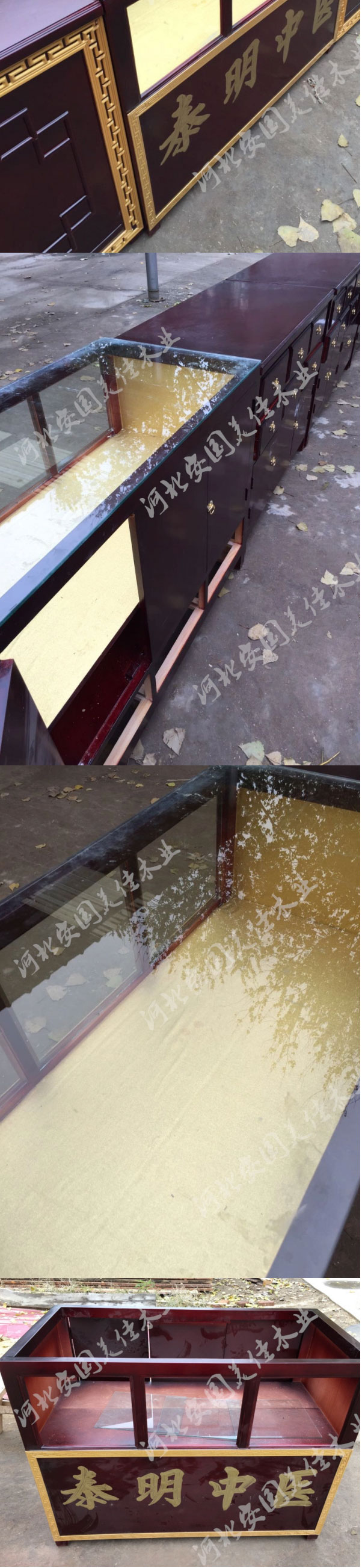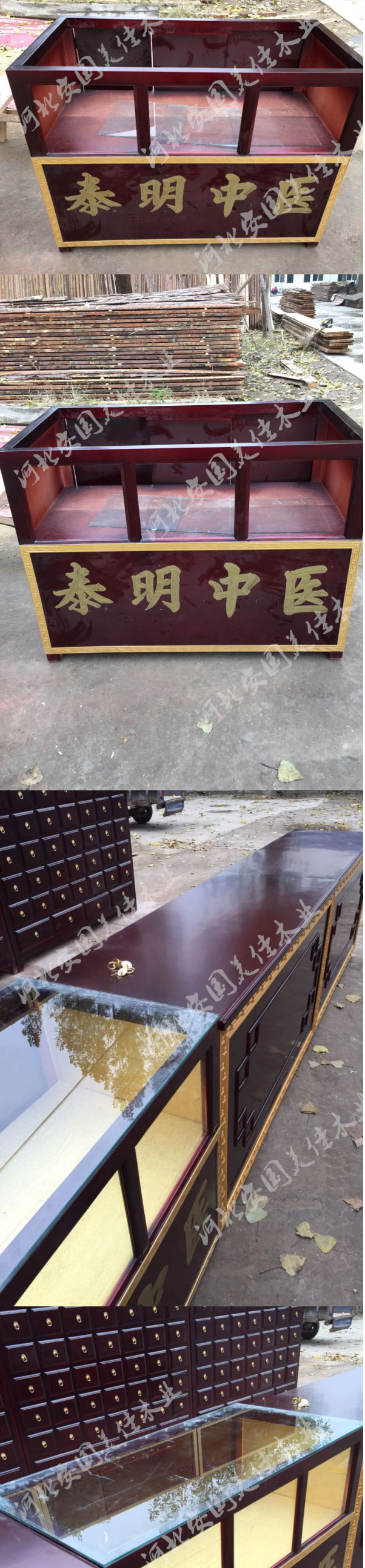 中藥柜展示臺用料---框架和抽屜選用優質樟松木,抽屜下面有五合板封底,防串味,抽屜底選用七合板,中藥柜的后背兩側頂部選用七合板