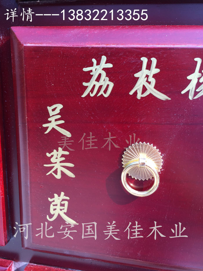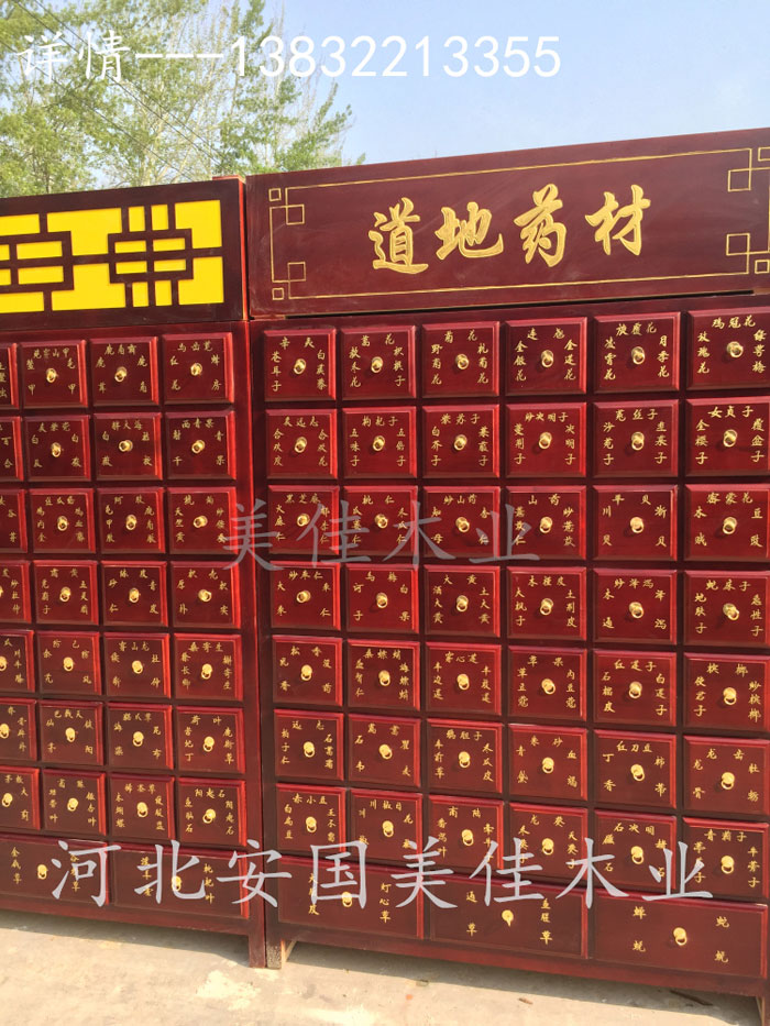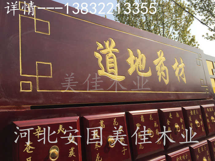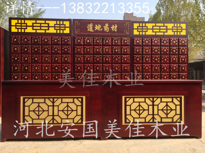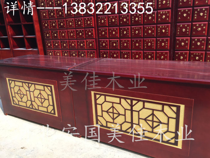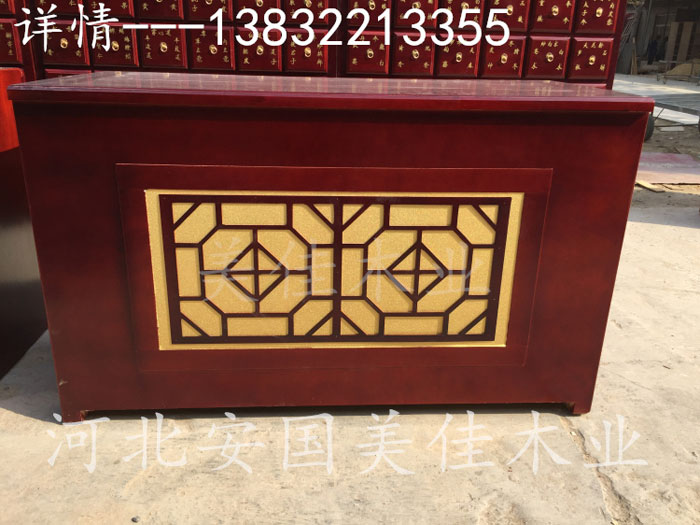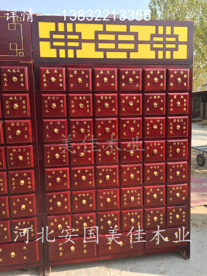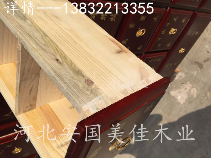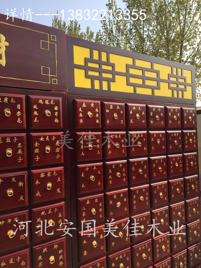 中藥柜尺寸---高220公分,寬150公分,厚60公分。抽屜面尺寸:寬18公分,高16公分。厚度18公分。中藥柜用料---框架和抽屜選用優質樟松木,抽屜下面有五合板封底,防串味,抽屜底選用七合板,中藥柜的后背兩側頂部選用七合板。中藥柜款式---橫六豎八款。橫著六個抽屜,豎著八層抽屜,較下面的三個大抽屜。根據客戶要求定做。中藥柜顏色---經典琥珀色花紋烤漆。燈箱外邊雕刻花型。中藥柜用漆---亮光或者半啞環保聚脂漆水房烤漆。中藥柜拉環---超精致純銅拉環。