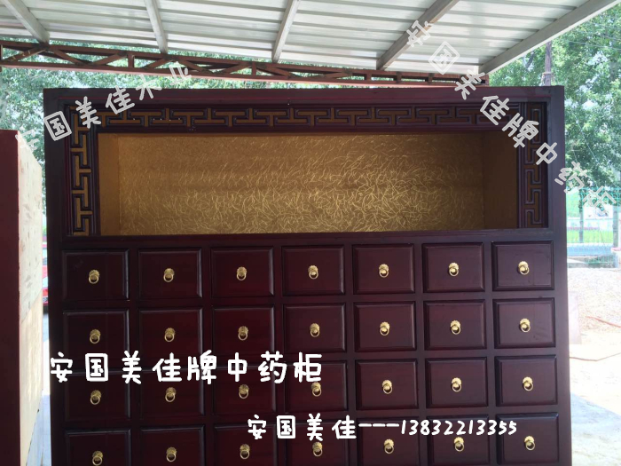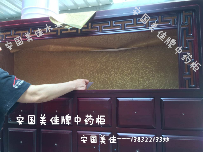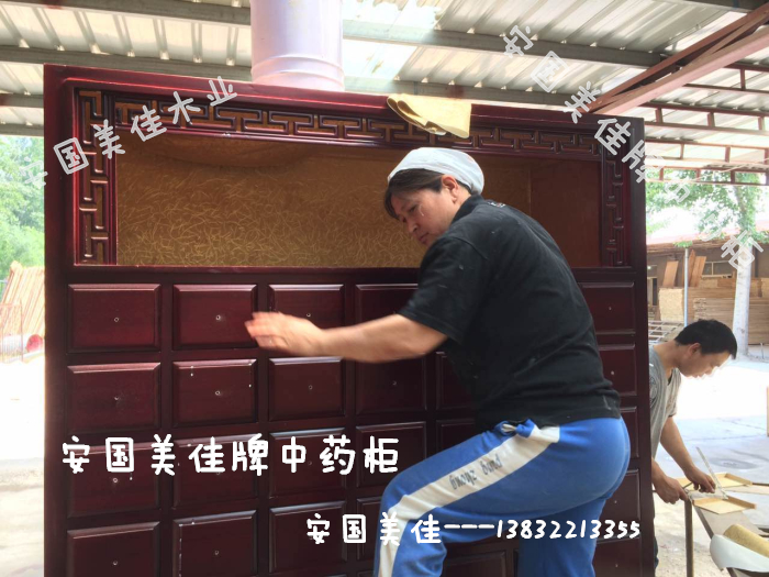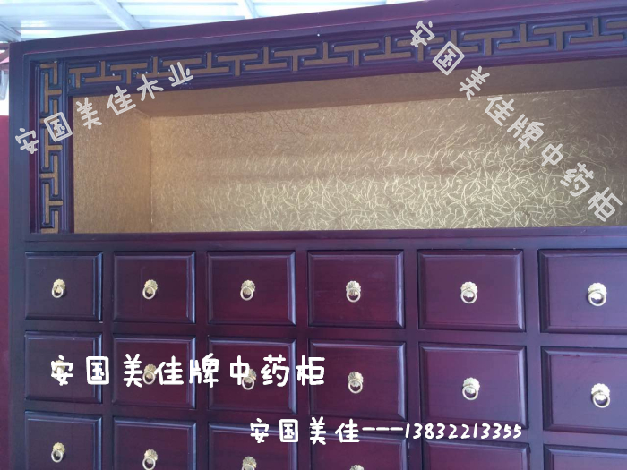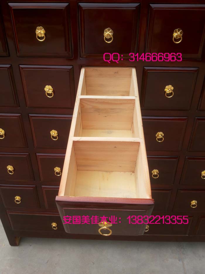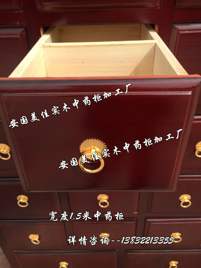 中藥柜用料---框架和抽屜選用優(yōu)質(zhì)樟松木,抽屜下面有五合板封底,防串味,抽屜底選用九厘板,中藥柜的后背兩側(cè)頂部選用五合板。