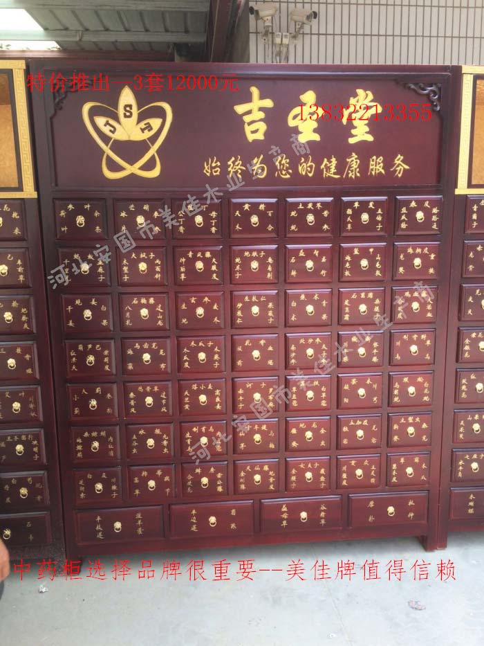 中藥柜尺寸---高215公分,寬170公分,厚60公分。抽屜面尺寸:寬18公分,高17公分。高度15公分。中藥柜用料---框架和抽屜選用優質樟松木,抽屜下面有五合板封底,防串味,抽屜底選用九厘板,中藥柜的后背兩側頂部選用五合板。中藥柜款式---橫七豎八款。橫著七個抽屜,豎著八層抽屜,較下面的四個大抽屜,每個抽屜兩味藥,每個中藥柜可以裝155味藥。中藥柜顏色---經典仿紅木色亮光花紋烤漆。中藥柜用漆---亮光或者半啞環保聚脂漆水房烤漆。中藥柜拉環---超精致純銅拉環。