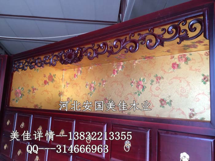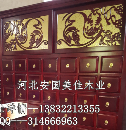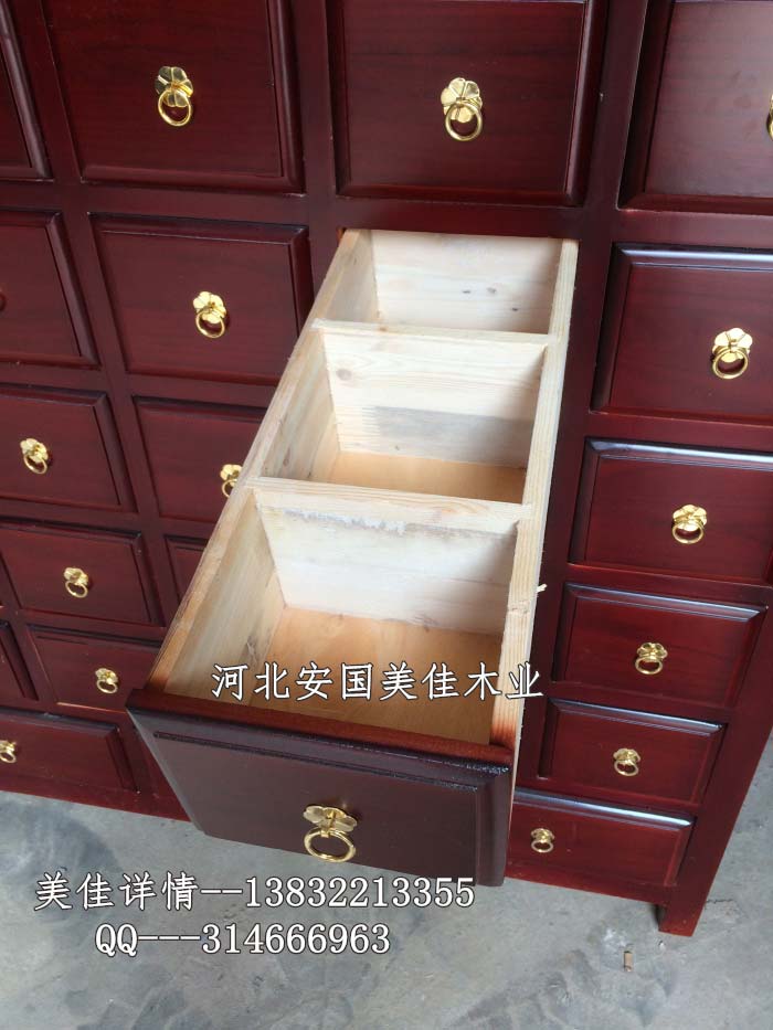 中藥柜尺寸---高215公分,寬170公分,厚60公分。抽屜面尺寸:寬18公分,高15公分。厚度17公分。中藥柜用料---框架和抽屜選用優質樟松木,抽屜下面有五合板封底,防串味,抽屜底選用九厘板,中藥柜的后背兩側頂部選用五合板。中藥柜款式---橫七豎八款。橫著七個抽屜,豎著八層抽屜,較下面的四個大抽屜,每個抽屜兩味藥,每個中藥柜可以裝155味藥。中藥柜顏色---經典仿紅木色花紋烤漆。中藥柜用漆---亮光或者半啞環保聚脂漆水房烤漆。中藥柜拉環---超精致純銅拉環。