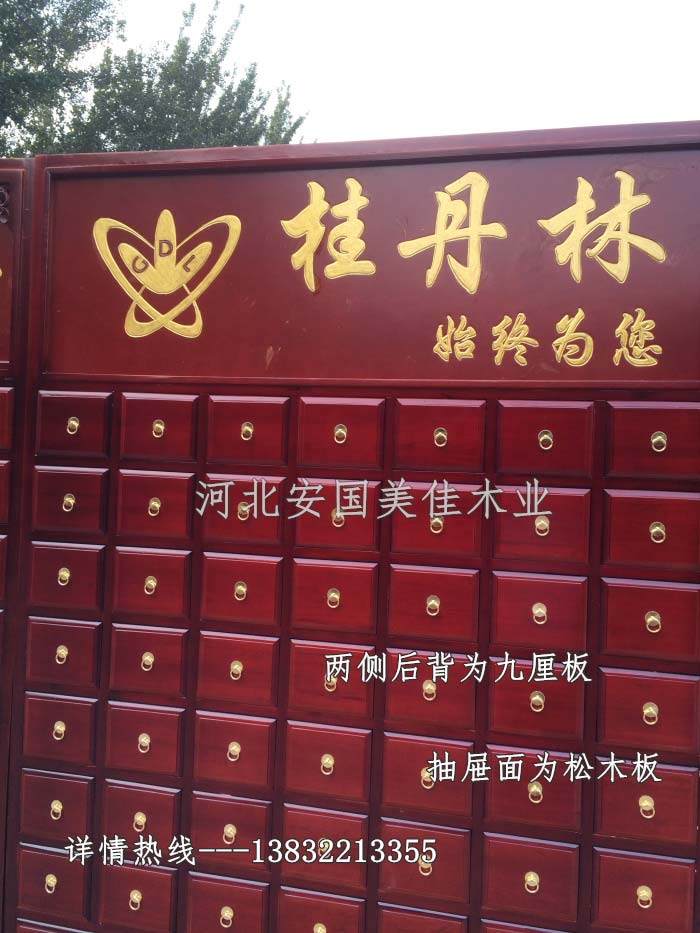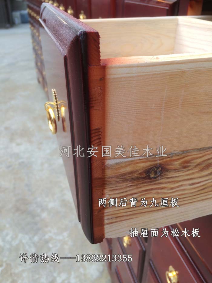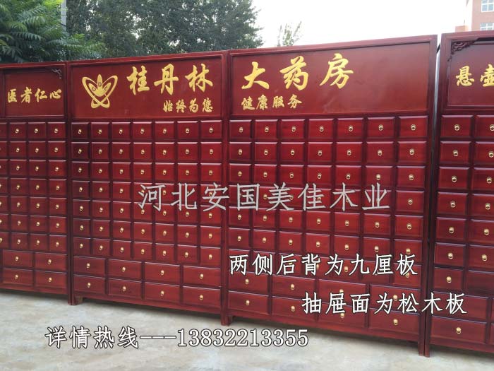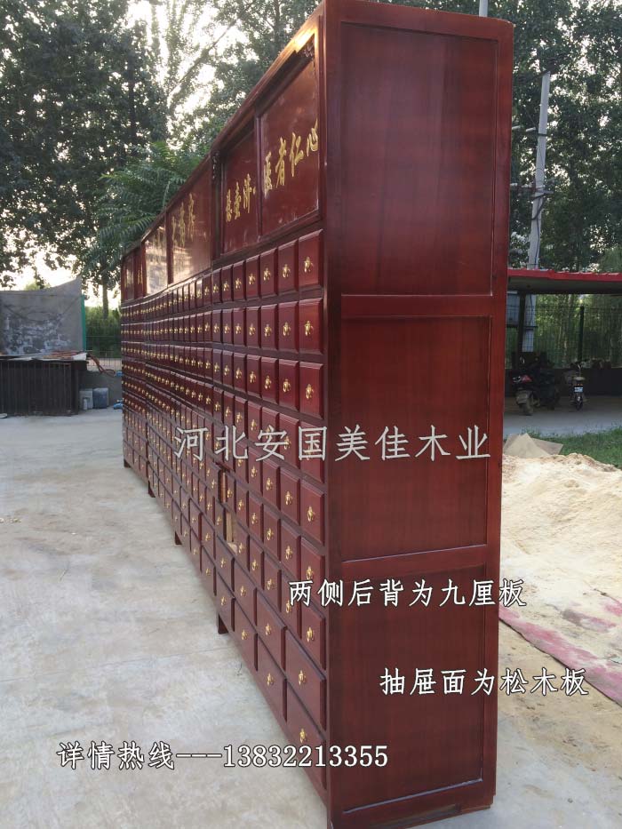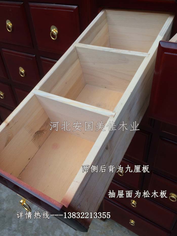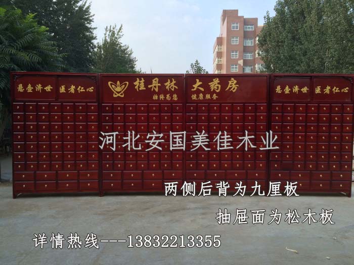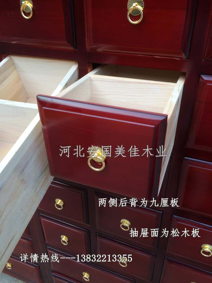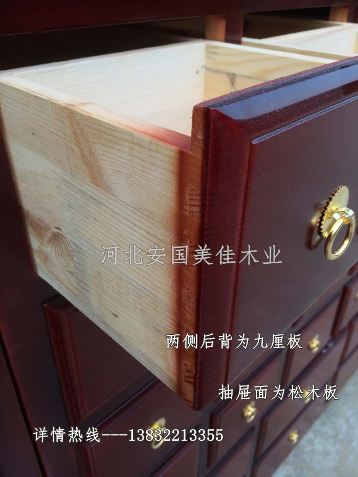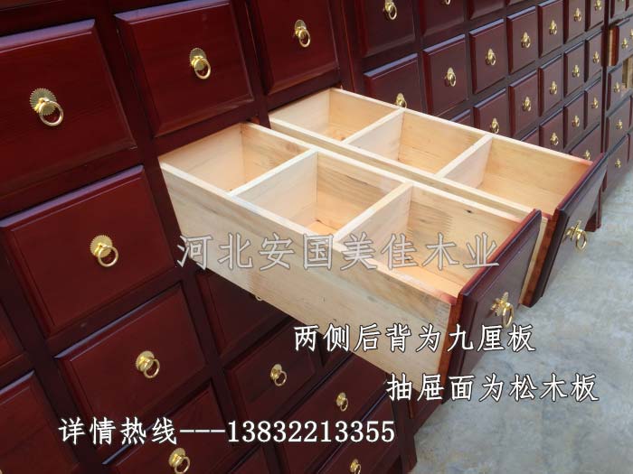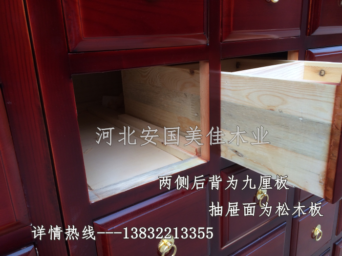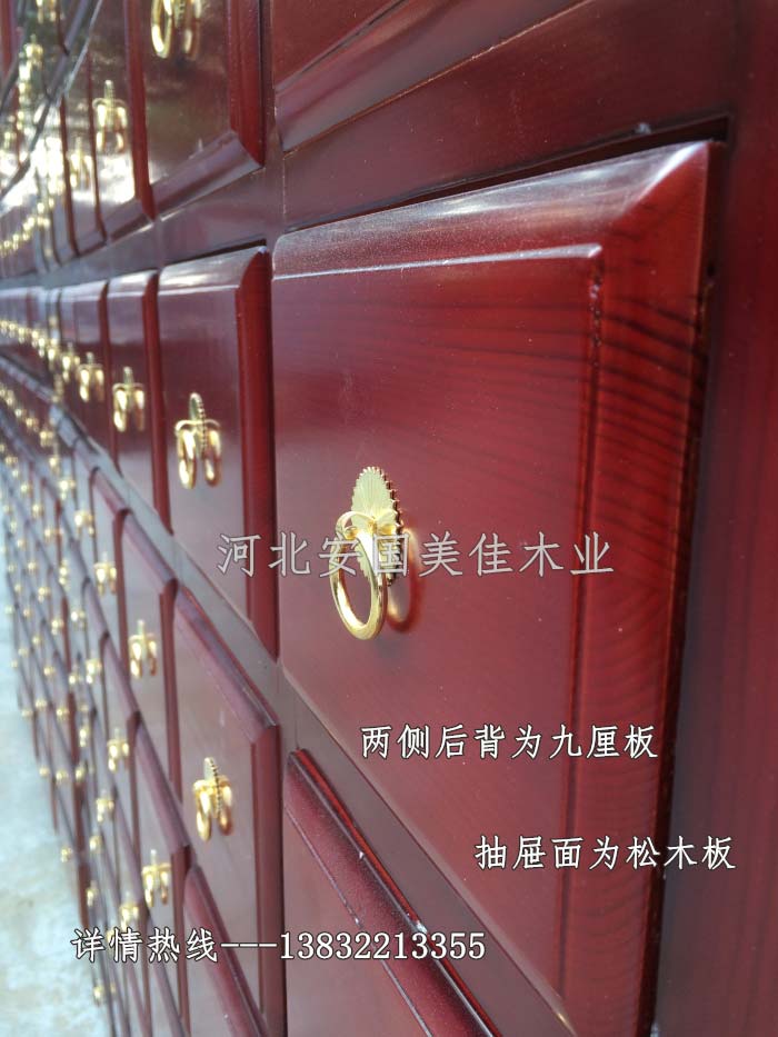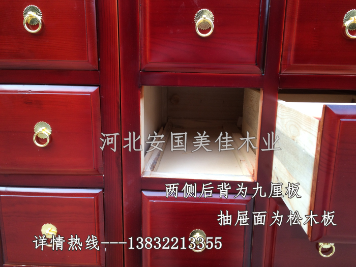 中藥柜尺寸---高240公分,寬170公分,厚60公分。抽屜面尺寸:寬18公分,高19公分。厚度17公分。中藥柜用料---框架和抽屜選用優質樟松木,抽屜下面有五合板封底,防串味,抽屜底選用七合板,中藥柜的后背兩側頂部選用九厘板。抽屜面為松木整塊板。中藥柜款式---橫七豎九款。橫著七個抽屜,豎著七層抽屜,較下面為兩排大抽屜,每個抽屜兩味藥,每個中藥柜可以裝163味藥。中藥柜顏色---經典仿紅木色花紋烤漆。中藥柜用漆---亮光或者半啞環保聚脂漆水房烤漆。中藥柜拉環---超精致純銅拉環。