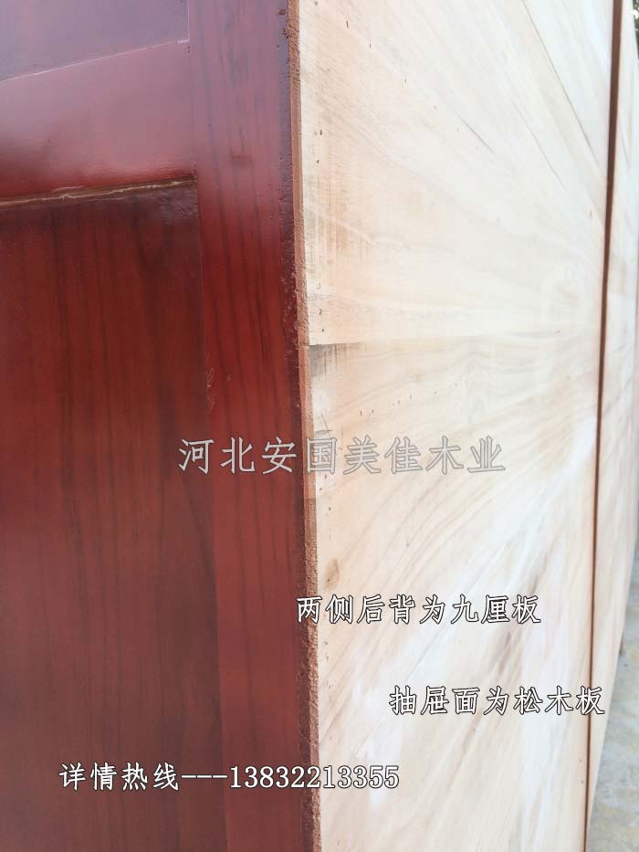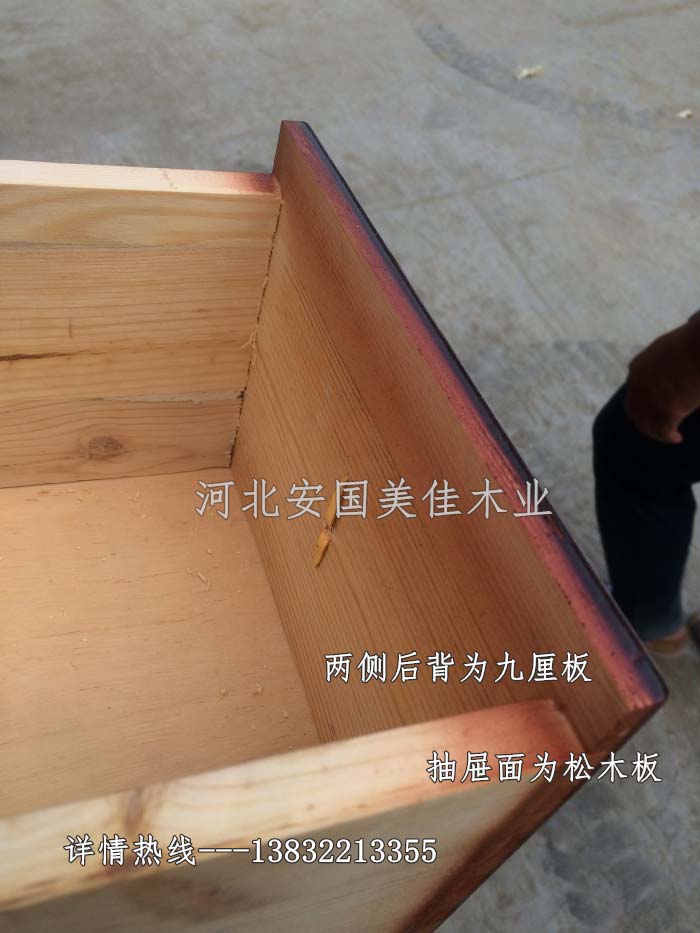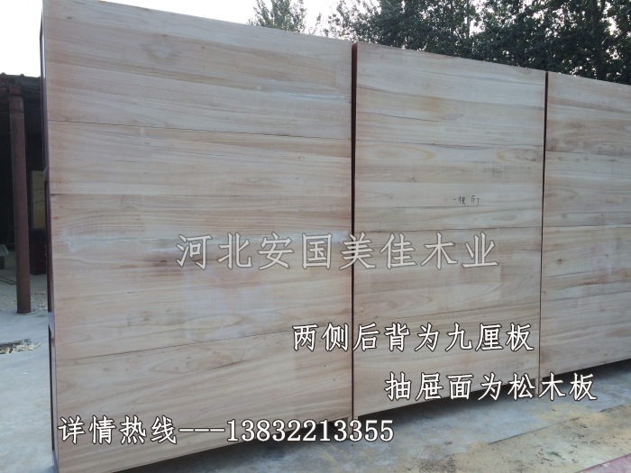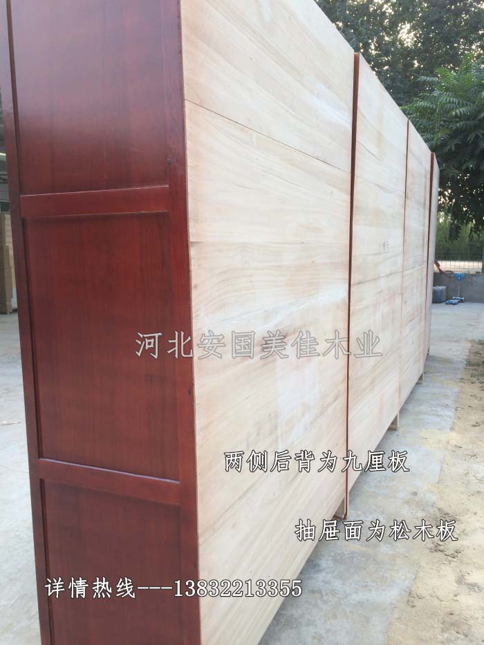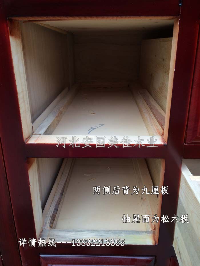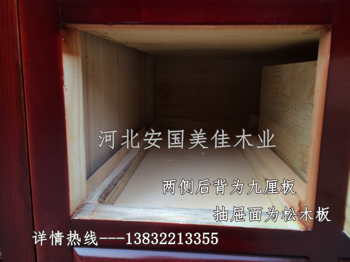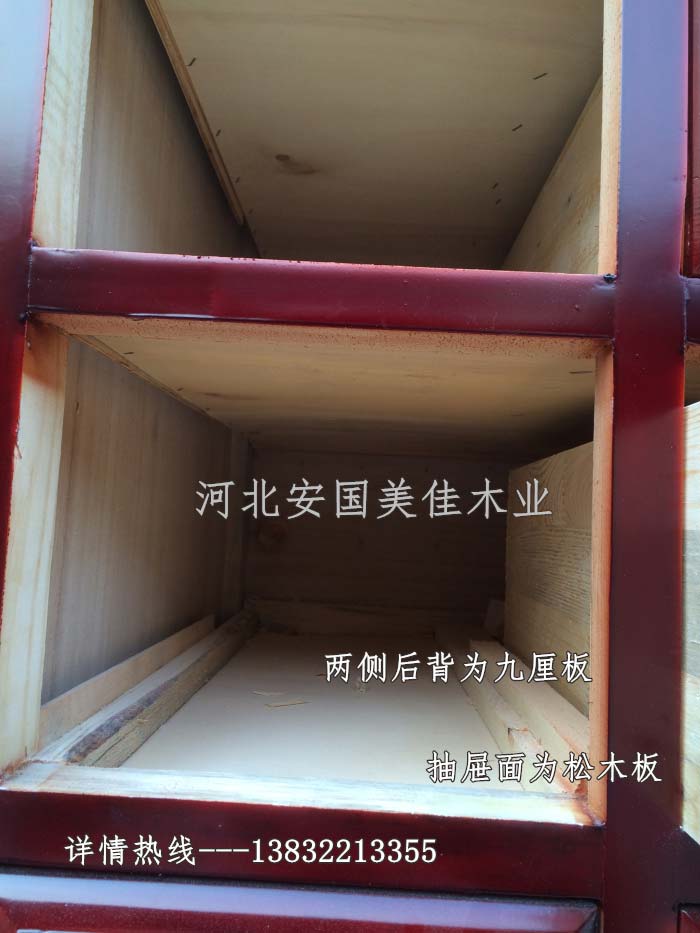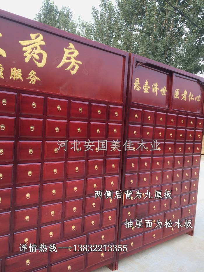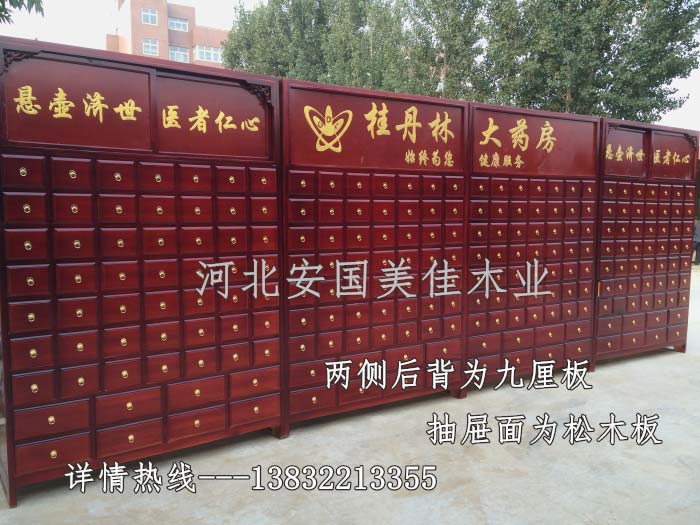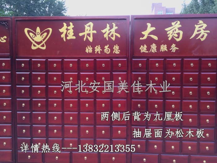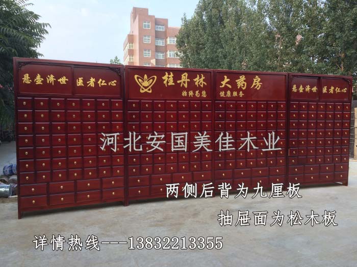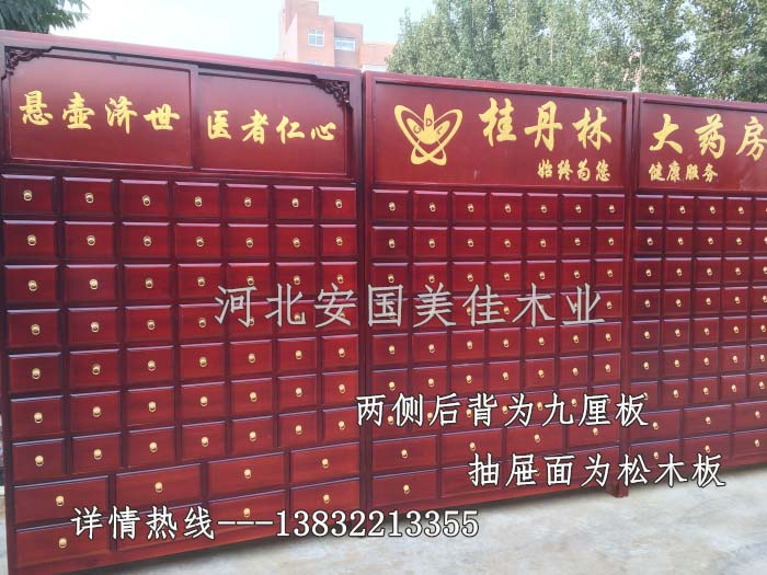 中藥柜尺寸---高240公分,寬170公分,厚60公分。抽屜面尺寸:寬18公分,高19公分。厚度17公分。中藥柜用料---框架和抽屜選用優質樟松木,抽屜下面有五合板封底,防串味,抽屜底選用七合板,中藥柜的后背兩側頂部選用九厘板。抽屜面為松木整塊板。中藥柜款式---橫七豎九款。橫著七個抽屜,豎著七層抽屜,較下面為兩排大抽屜,每個抽屜兩味藥,每個中藥柜可以裝163味藥。中藥柜顏色---經典仿紅木色花紋烤漆。中藥柜用漆---亮光或者半啞環保聚脂漆水房烤漆。中藥柜拉環---超精致純銅拉環。
