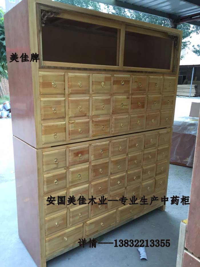中藥柜款式---橫七豎八款。橫著七個(gè)抽屜,豎著八層抽屜,較下面的四個(gè)大抽屜,每個(gè)抽屜兩味藥,每個(gè)中藥柜可以裝155味藥。分體柜。