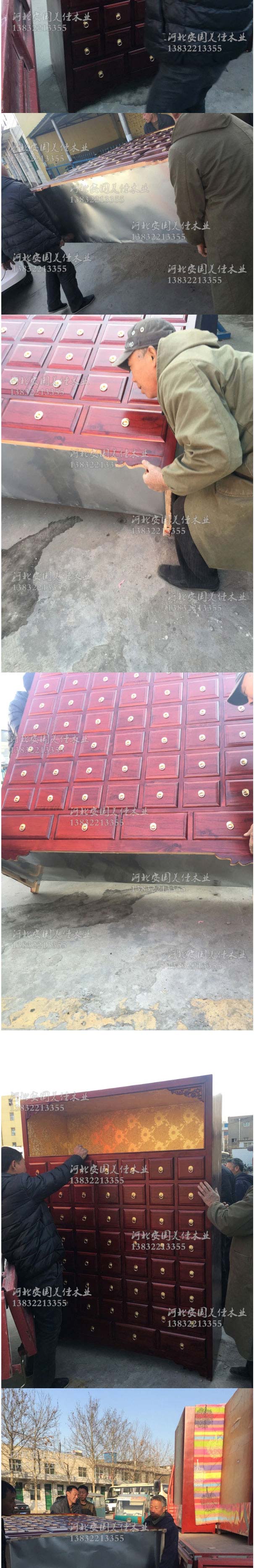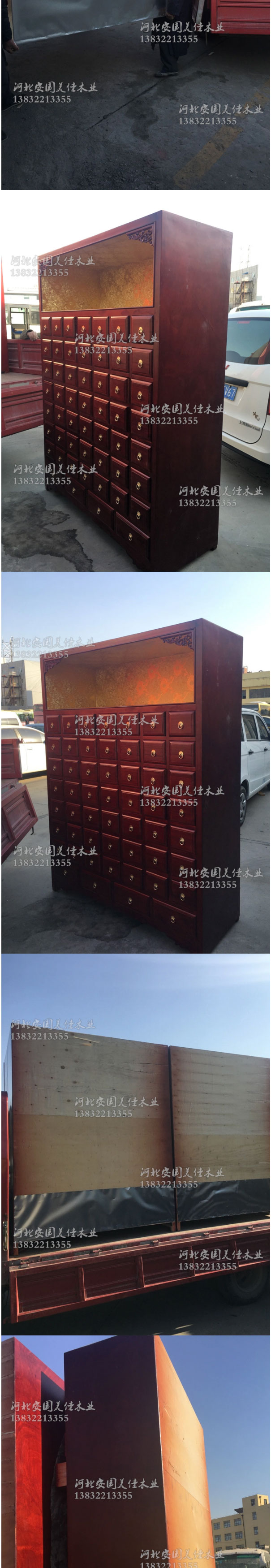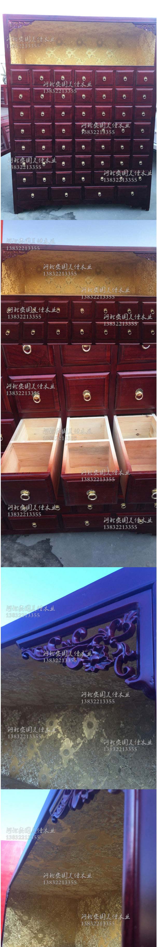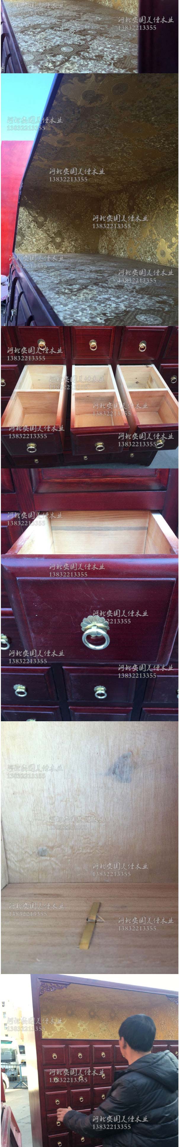 中藥柜尺寸---高220公分,寬157公分,厚60公分。抽屜面尺寸:寬17公分,高14公分。厚度18公分。中藥柜用料---框架和抽屜選用優(yōu)質(zhì)樟松木,抽屜下面有五合板封底,防串味,抽屜底選用七合板,中藥柜的后背兩側(cè)頂部選用七合板。中藥柜款式---橫七豎八款。橫著七個抽屜,豎著八層抽屜,較下面的四個大抽屜,每個抽屜兩味藥,每個中藥柜可以裝155味藥。中藥柜顏色---經(jīng)典琥珀色花紋烤漆。中藥柜用漆---亮光或者半啞環(huán)保聚脂漆水房烤漆。中藥柜拉環(huán)----超精致純銅拉環(huán)。