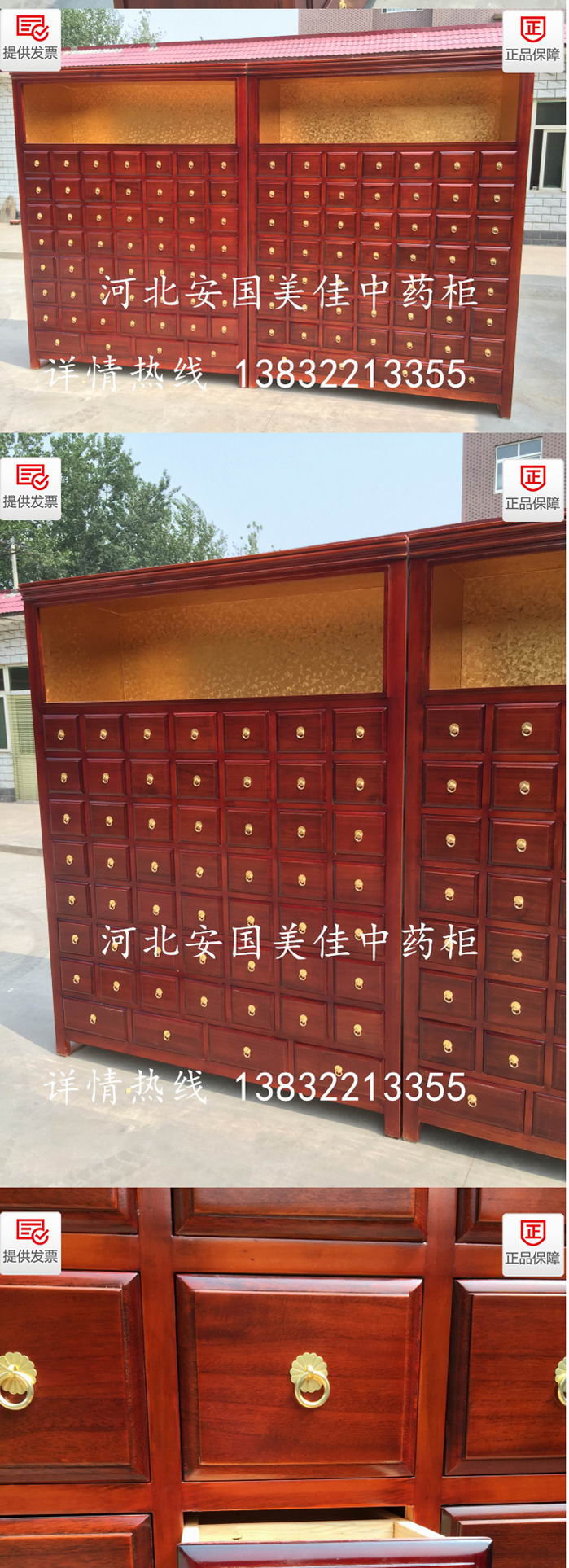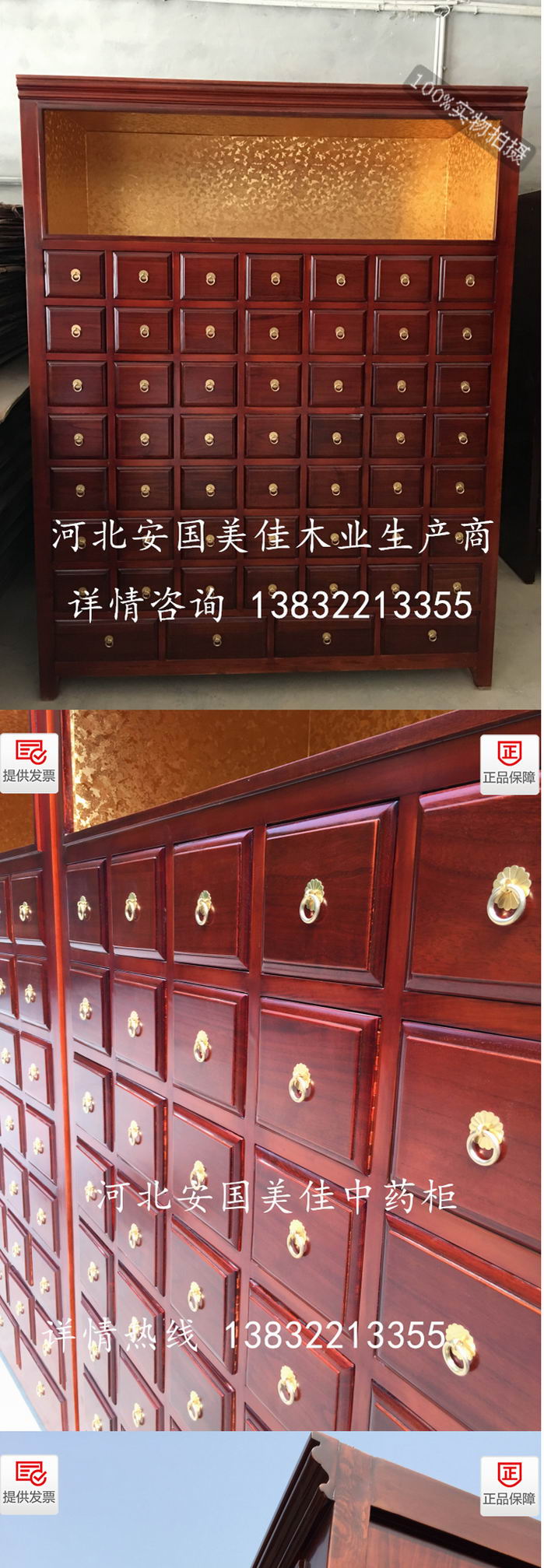 中藥柜尺寸---高215公分,寬170公分,厚60公分。抽屜面尺寸:寬17公分,高14公分。厚度18公分。中藥柜用料---框架和抽屜選用優質樟松木,抽屜下面有七合板封底,防串味,抽屜底選用實木板,中藥柜的兩側頂部選用實木板。中藥柜款式---橫七豎八款。橫著七個抽屜,豎著八層抽屜,較下面的四個大抽屜,每個抽屜兩味藥,每個中藥柜可以裝155味藥。中藥柜顏色---經典琥珀色花紋烤漆。中藥柜用漆---亮光或者半啞環保聚脂漆水房烤漆。中藥柜拉環---超精致純銅拉環。