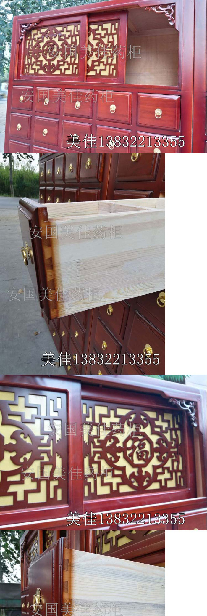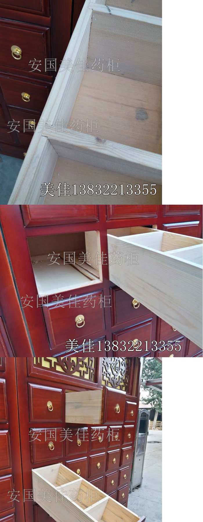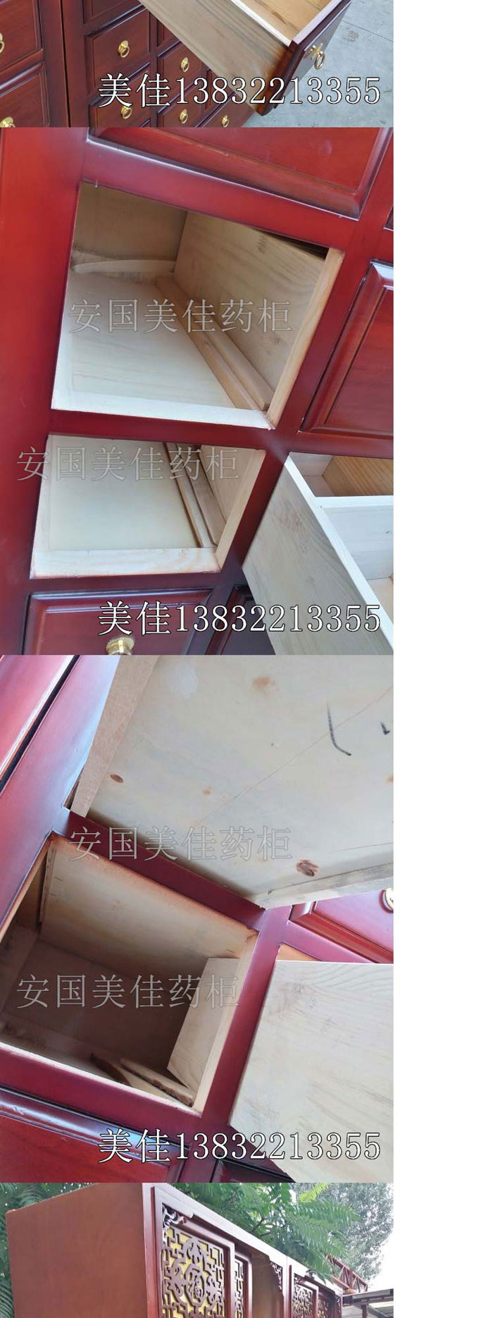 中藥柜用料---框架和抽屜選用優(yōu)質(zhì)蒸熏過的樟松木,抽屜上下面有七合板隔層,防串味,防掉藥。抽屜底,中藥柜的后背,兩側(cè)頂部選用七合板。中藥柜的底部和后背(40公分)有鐵皮封底,防鼠。